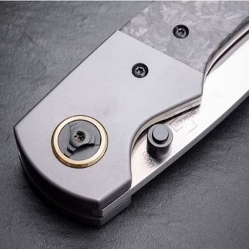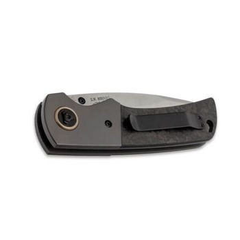 Grauer Griff aus Kohlefaser und Titan, mit Lanyard-Öse und abnehmbarem Clip, ein messingfarbener Ring um die Achse sorgt für einen optischen Kontrast.