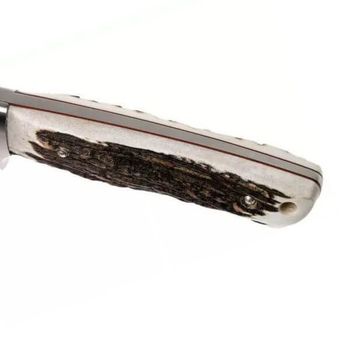 Griffschalen aus Hirschhorn und unter den Hornplättchen Schichten aus roter Faser für einen herrlichen Kontrast.