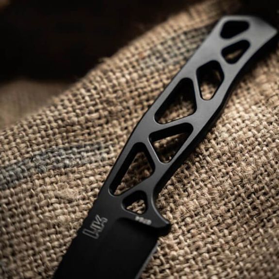 Couteau outdoor tout en acier de taille moyenne à la construction squelettique. Peut être porté sur un harnais MOLLE ou dissimulé.