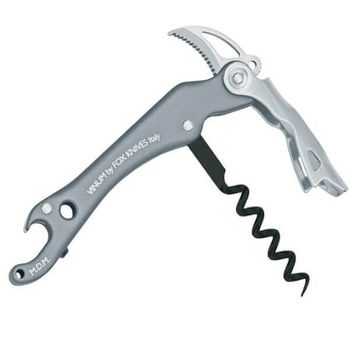 Sommeliermesser „VINUM“ (Herstellung Fox) 3-teilig (gezahnte Kapselschneiderklinge, Hebel, Korkenzieher, Teflondocht), Griff 12 cm titanium-eloxiertes Aluminium mit Flaschenöffner am Ende.