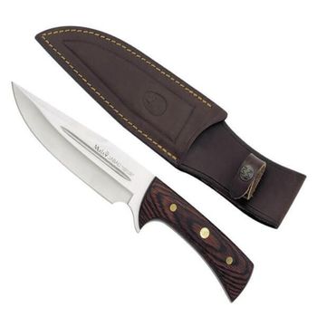A smooth-bladed hunting knife made of corrosion-resistant X50CrMoV15 stainless steel with Muela "Jabali" inscription on the blade.