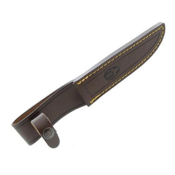 Geliefert wird das Messer in einem Lederetui mit Steppnähten und Muela-Logo sowie einem Druckknopf, der das Messer im Etui hält.