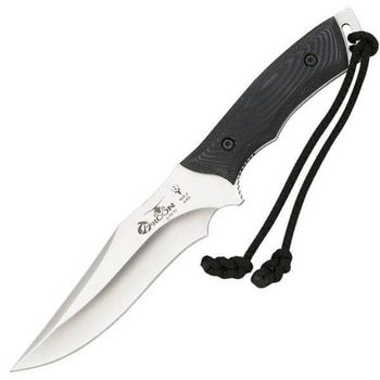 A hunting knife with a smooth full tang blade made of corrosion resistant X50CrMoV15 Clip Point stainless steel with Muela "Typhon" inscription on the blade.