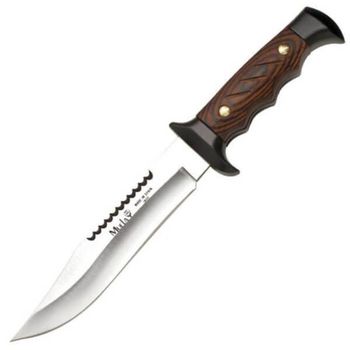 A smooth and serrated hunting knife made of corrosion resistant 420 stainless steel with Muela inscription on the blade.