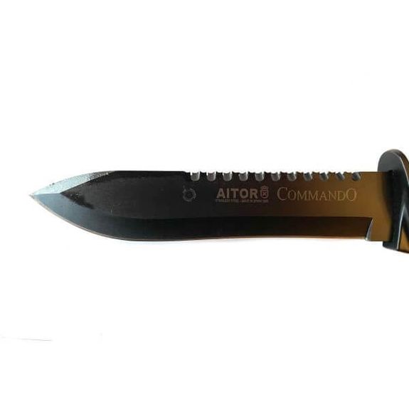 The Commando from Aitor has a 17.5 cm blade, 5 mm thick, with a 9 cm semi-serrated upper section for sawing branches, for example.