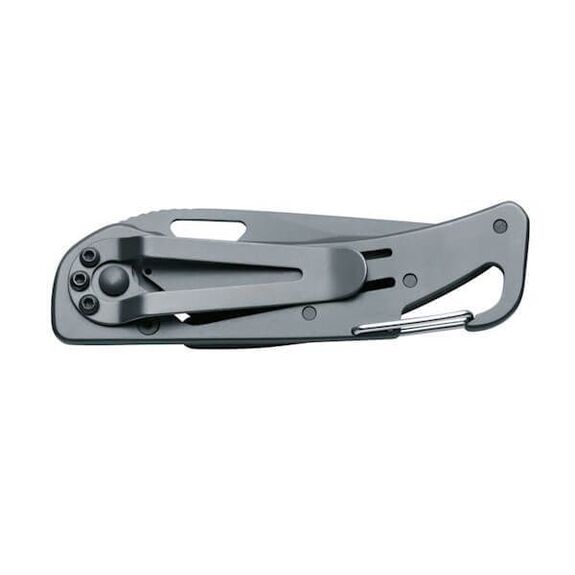 It includes a belt clip, a double one-handed opening button, and a carabiner.
