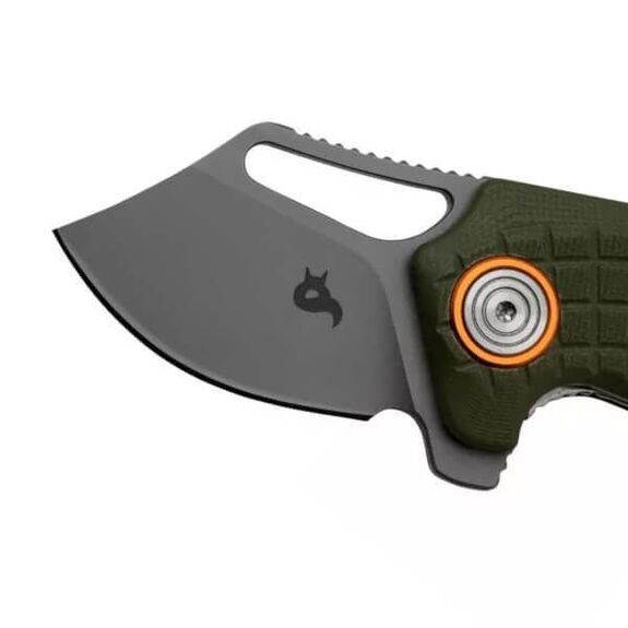 Robust, lightweight green G10 handle with red anodised aluminium pivot and spacer.
