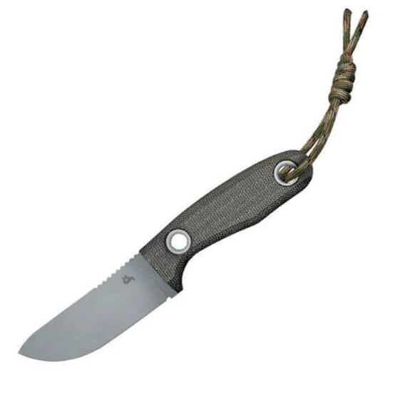 Satinierte Klinge aus D2-Stahl mit einer Härte von 59–61 HRC. Die Riffelung auf der Klingenoberseite verhindert das Abrutschen des Daumens. Mit eingraviertem Black Fox-Logo. Grauer Micarta-Griff mit zwei Löchern und Tarn-Nylon-Fangriemen. Hervorragende Ergonomie. Inklusive Kydex®-Gürtelscheide mit Tek-Lok®-Befestigungssystem und Feuerstarter.
