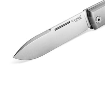 The blade is made from 61HRC Austrian sintered steel M390, a steel that retains its sharpness for a long time and is extremely hard-wearing. The blade has a Drop Point shape with a slipjoint blade lock. It opens via a nailnick (notch on the blade).
