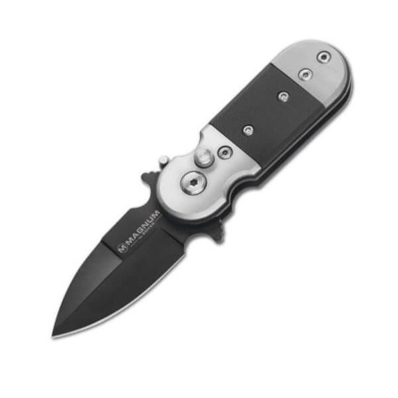A smooth Spear Point and blackened 440A steel blade with a double guard.