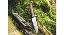 Jagdmesser mit Drop Point geformter Klinge, glatter Schneide aus 440 A rostfreiem Stahl und einem eleganten Griff aus Rosenholz (Palisander) und Ebenholz.