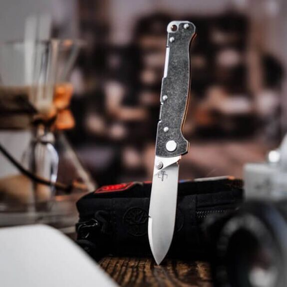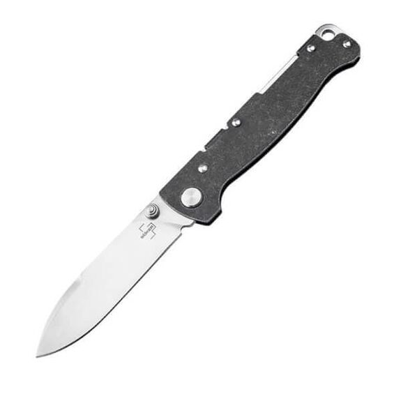 A satin-finished drop-point blade made of D2 stainless steel, durable and with good edge retention, perfect for daily use.