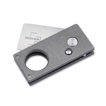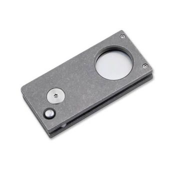 The extremely compact pocket knife with a 440C blade has a striking opening in the titanium handle, which allows cigars to be cut when the knife is closed. By pressing the push button on the front, the blade springs out of the handle at 45°, exposing the opening for inserting a cigar. However, if you press the button on the back at the same time, the blade opens completely like a small automatic knife. The short blade with a one-sided bevel is suitable for small everyday jobs.