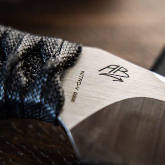 Eine 4 mm dicke, glatte Klinge aus Nitro-V-Stahl mit durchgehender Klinge in Clip-Point-Form, geringe Korrosionsanfälligkeit, hervorragend geeignet für Schneidarbeiten in der Natur. Gebürstete Oberfläche.
