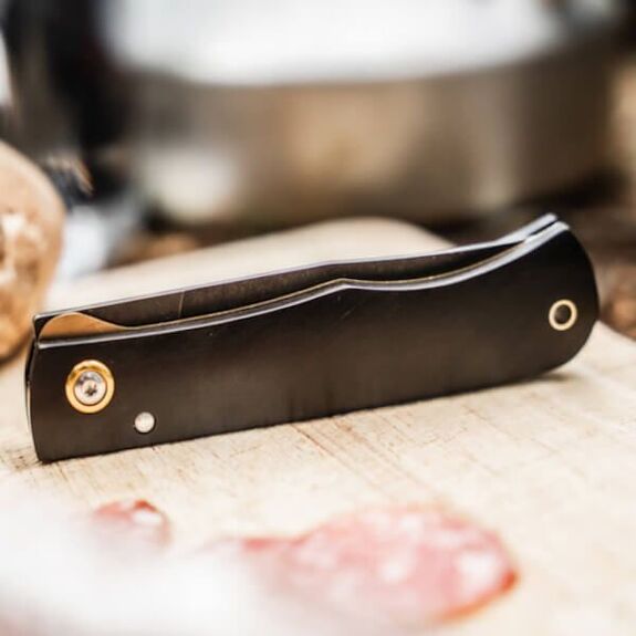 Handle in rustic ebony, brass-coloured parts such as the lock plate, the outer ring of the blade pivot screw and the hole for the lanyard.