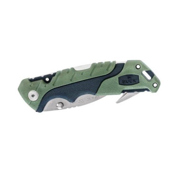 Black nylon sheath with green trim provided for horizontal or vertical belt carry
