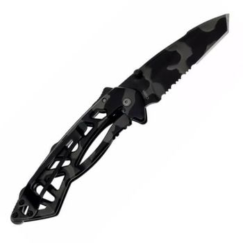 Halbverzahnte Klinge aus 420HC-Stahl (Härtegrad 58HRC) in Tanto-Form mit tarnschwarzer Beschichtung und Öffnung durch Daumennocken.