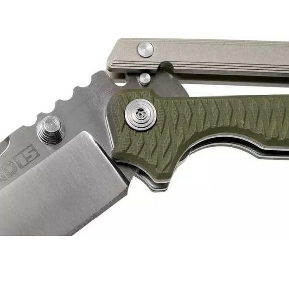 The green handle is partly made of 3D machined G10 coupled with steel liners while the upper part is machined from 3D machined 6061 aluminium which conceals a powerful compression spring.
