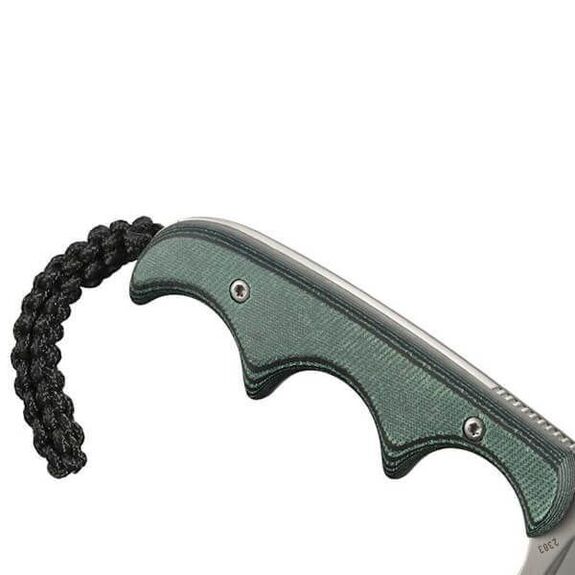 Une lame lisse en acier inoxydable 5Cr15MoV durable forme Cleaver et finition par microbillage. Manche en micarta vert/noir avec empreintes de doigts pour un maintien ergonomique.