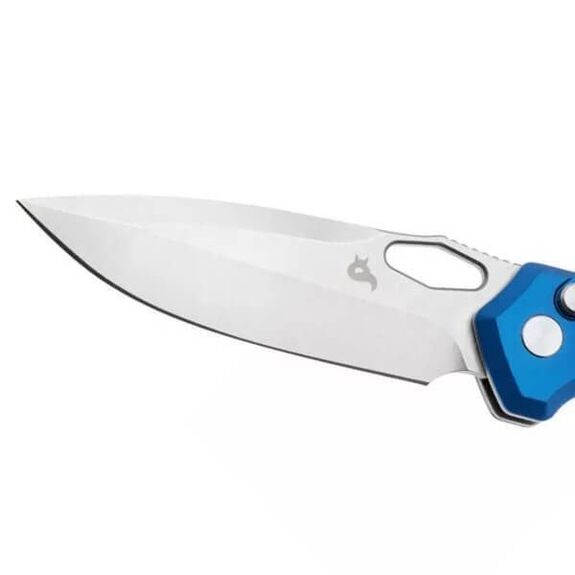 Une lame à trou satinée et finition stonewashed avec bouton de verrouillage/déverrouillage de forme Spearpoint.