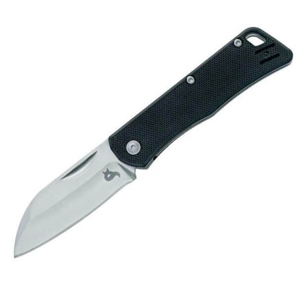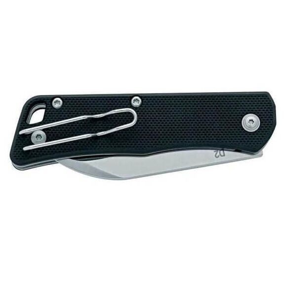 Manche en G10 noir, un mélange de résine synthétique et de fibre de verre.