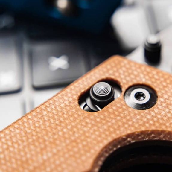 Les plaquettes du manche sont en micarta brun, les vis sont noires pour un contraste parfait.
