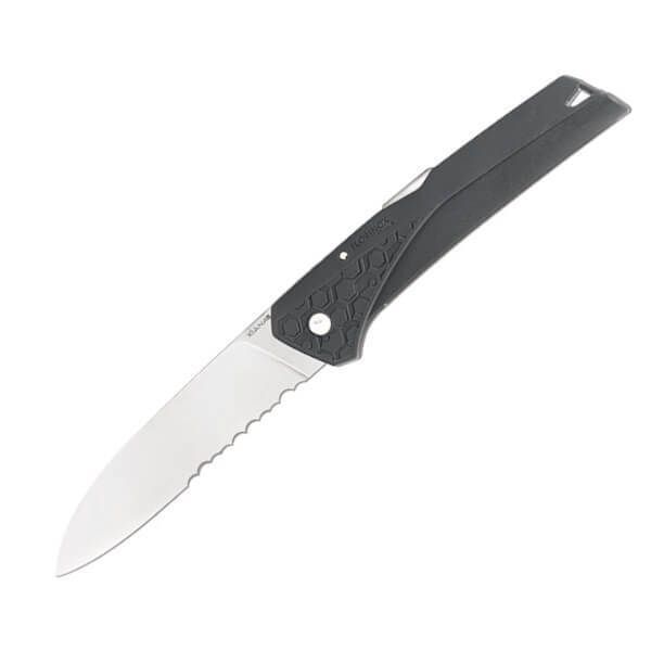 Lame mixte en acier inoxydable X35Cr16N à cran de forme pointe tombante.