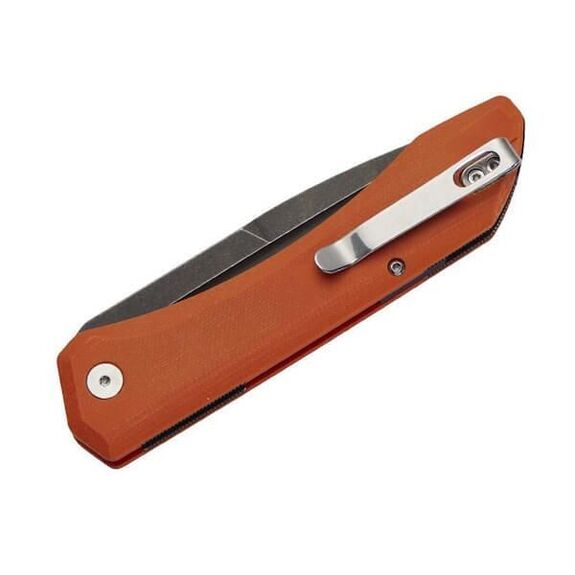 Manche en micarta orange. Le Micarta est connu pour sa durabilité et sa résistance à l'humidité, ce qui en fait un excellent choix pour les conditions extérieures.