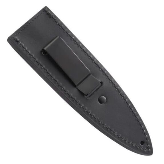 Micarta wafer handle and leather sheath with clip.