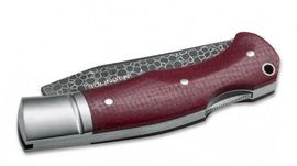 The scales are made of red jute micarta, comfortable in the hand and durable.