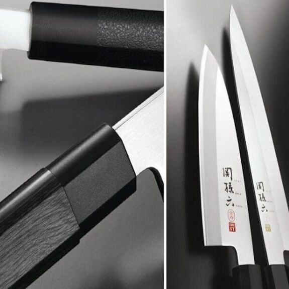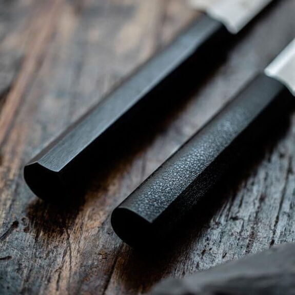 Designed for left-handed users, Hekiju knives also feature a typically Japanese single-bevel blade. The handle, which is more rounded than that of the Kinju series, is made of resin with a faux leather embossing.