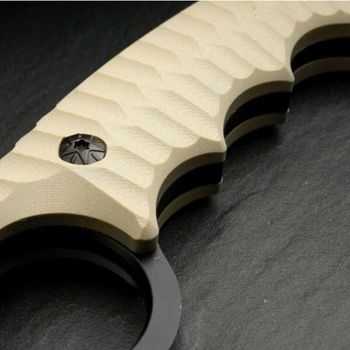 Griff aus strukturierten G10-Plättchen in der Farbe TAN(sandfarben) für sicheren Halt der Hand, Ring auf der Rückseite für schnelles Ziehen. Fingerprints für eine perfekte Ergonomie.