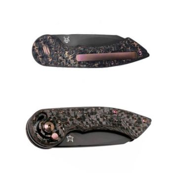 A sublime 11.5cm carbon fibre handle inlaid with copper wire and textured like a snakeskin. Excellent ergonomics. Pink anodised titanium screws, black PVD titanium spacer, pink anodised titanium button