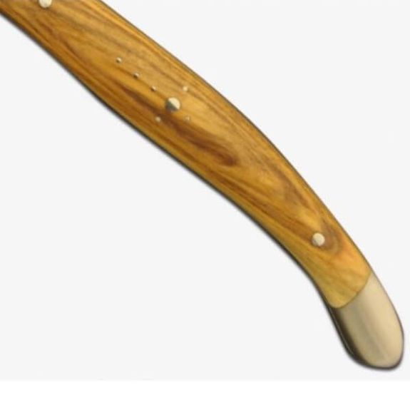 The 11cm handle is made of first quality grained olive wood, 6mm thick per plate. Traditional inlaid shepherd's cross which, according to legend, the shepherds of the Massif Central used their knife planted in the ground to pray. This cross remains a distinctive sign of the Laguiole knife.