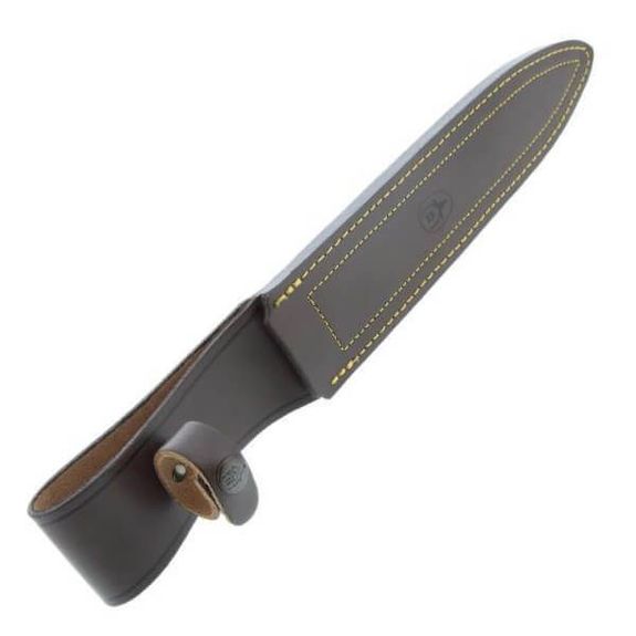 Geliefert wird das Messer in einer gelb abgesteppten Lederscheide mit Muela-Logo und Druckknopf, um das Messer in der Scheide zu halten.