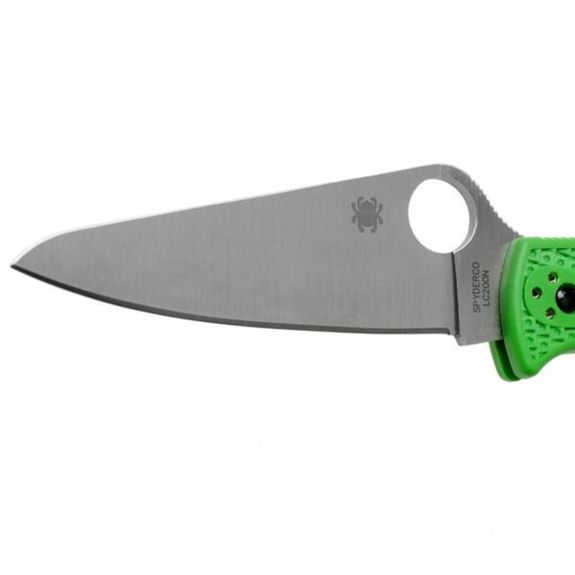 Weiße, glatte, satinierte Klinge aus LC200N-Stahl, Härtegrad 58HRC mit Sheepfoot-Clip , Öffnung mit dem Daumen durch das Loch in der Klinge, das etwas größer als üblich ist, da es leichter mit behandschuhten, nassen oder kalten Händen zu öffnen ist.