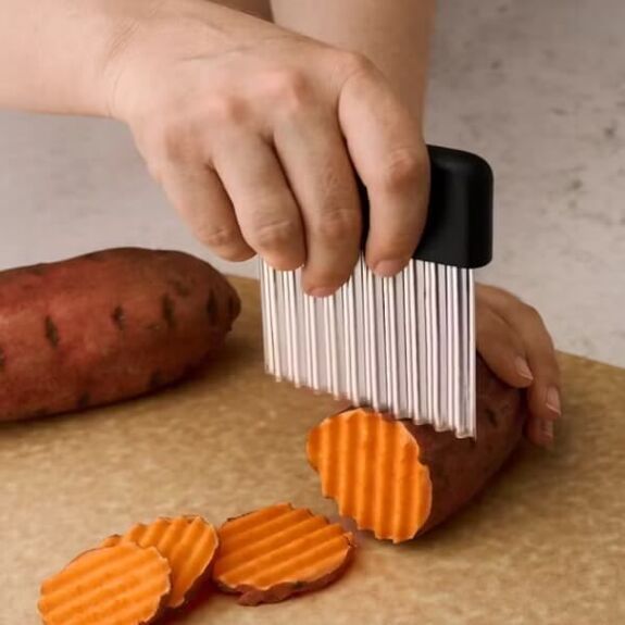 Sa lame ondulée en acier inoxydable donne instantanément un effet gaufré à divers ingrédients.