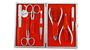 Alpen red leather manicure set, 7 pieces, satin stainless steel, soft black, with frame clasp.
