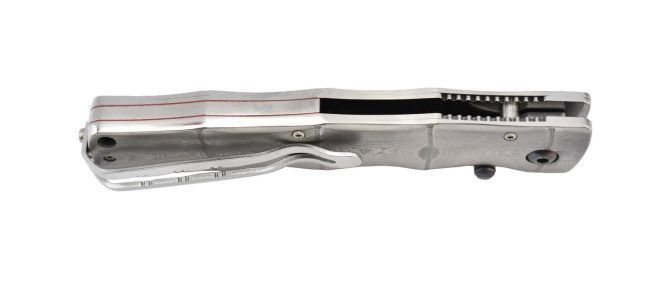 66-layer damasked stainless steel handle machined by high-performance machine tools, which gives it a wavy shape and allows an optimal grip with a belt clip.