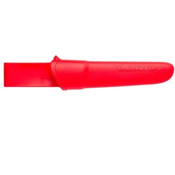 Das rote Hartschalenholster aus Polymer hat einen Gürtelclip, mit dem Sie das Messer an Ihrem Rucksack oder Gürtel befestigen können.