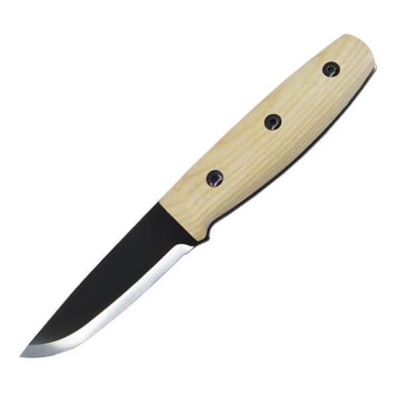 A full tang blade made of recycled Swedish stainless steel with a Drop Point shape. Black anti-corrosion coating.