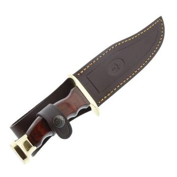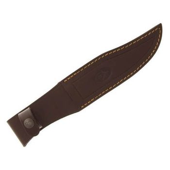 It comes with a sturdy brown leather sheath with the brand logo and stitching.