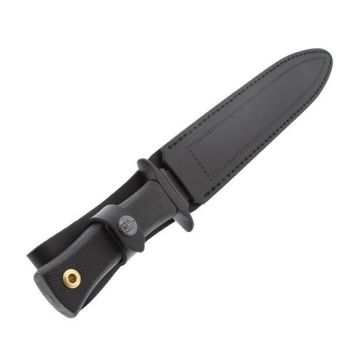 The sheath is made of high quality leather with black stitching and a Muela logo.