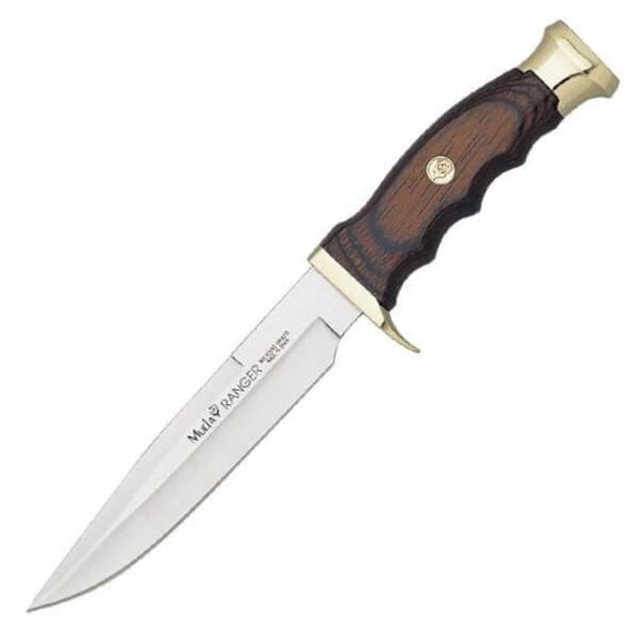 A smooth-bladed hunting knife made of corrosion-resistant X50CrMoV15 stainless steel with the Muela "Ranger" inscription on the blade.