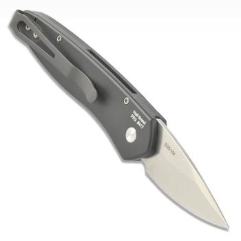 A Spear Point blade in CPM-135VN steel with a stonewashed finish. Pro-Tech engraved on the blade.
