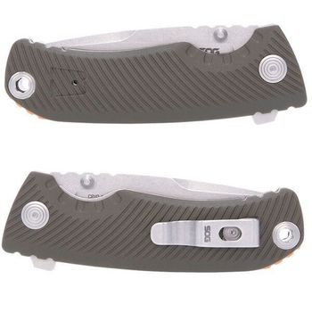 Griff aus GRN (beliebt für seine Stärke und Schlagfestigkeit, mit Glasfaserzusatz), olivgrün mit orangefarbener Innenseite.
