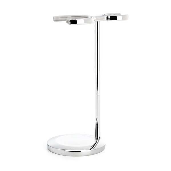 Un support en laiton chromé pour tous les blaireaux et rasoirs Muhle gamme Vivo.