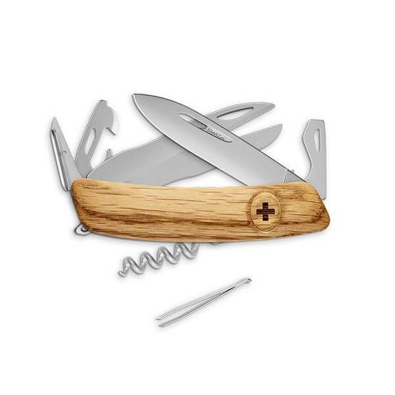 Swiza folding knife, 12-function model from the D07 series with oak handle scissors.
