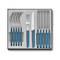 An 18/10 stainless steel cutlery set with a cornflower copolymer polypropylene handle for everyday family meals.
