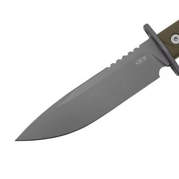 Le manche en G10 vert olive avec rainures pour un maintien sans faille et double garde.